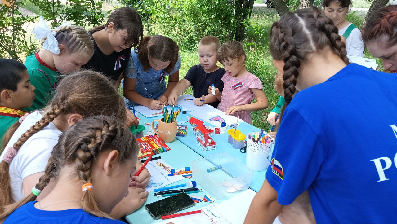 В тени деревьев были размещены выставки детских рисунков, рядом - художественная студия, где каждый ребенок мог написать письмо бойцам СВО, нарисовать символы России.