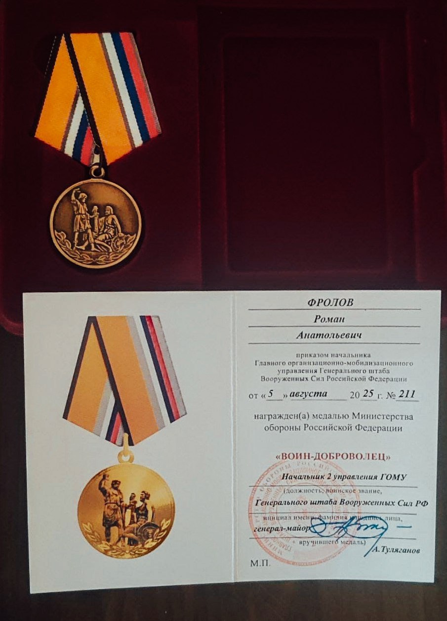 Студент Института юстиции СГЮА, участник специальной военной операции Роман Фролов награжден ведомственной медалью Министерства обороны Российской Федерации «Воин-доброволец».