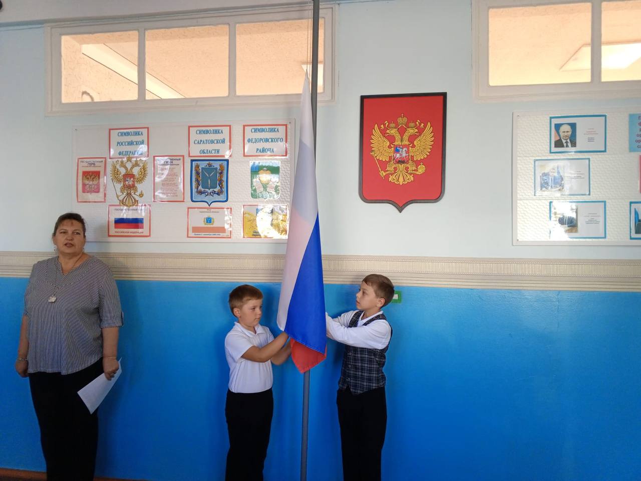 15 сентября традиционно в школе села Федоровка имени Героя Советского Союза И.С. Гавва прошла еженедельная линейка, которая начинается с исполнения гимна Российской Федерации и поднятия государственного флага.