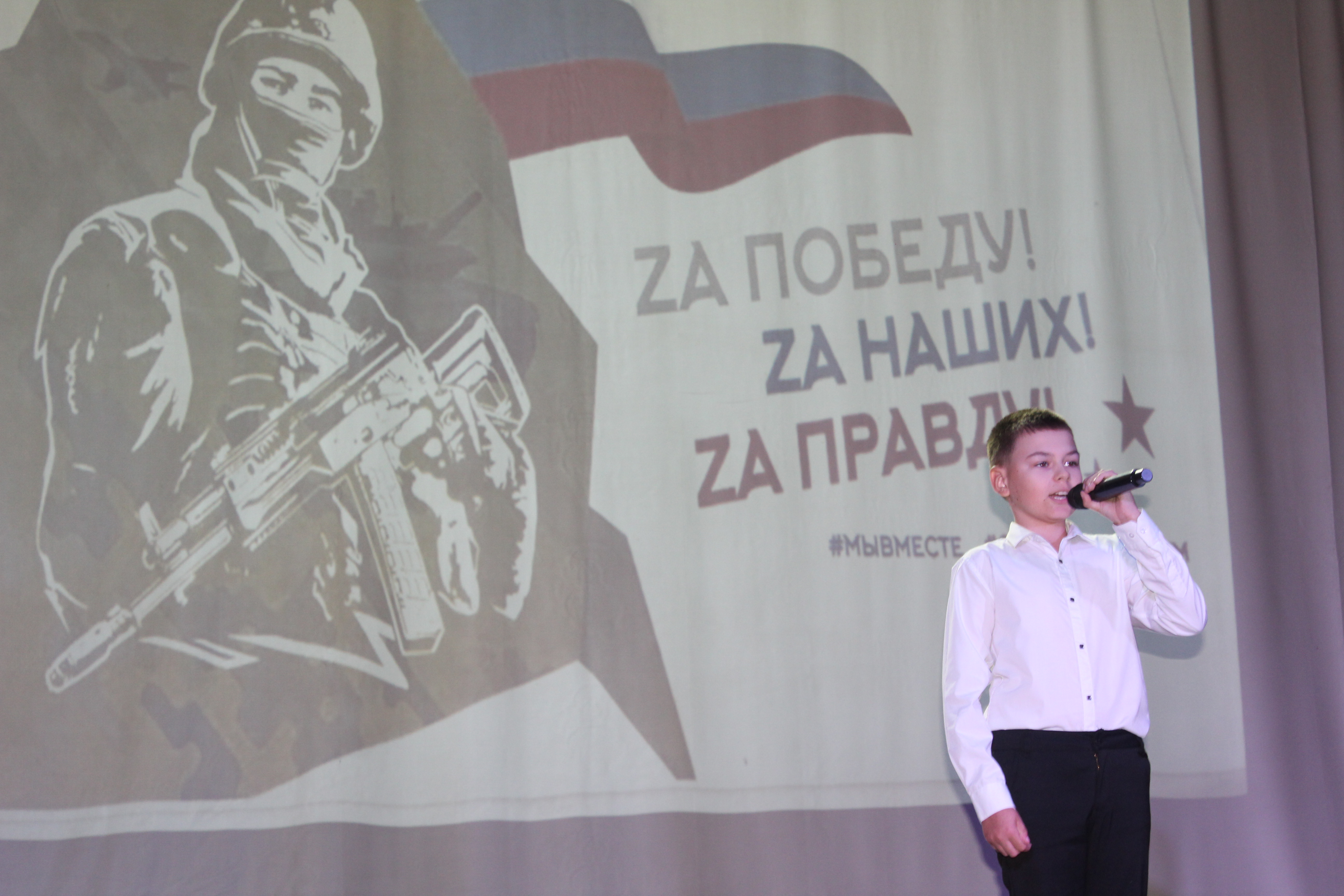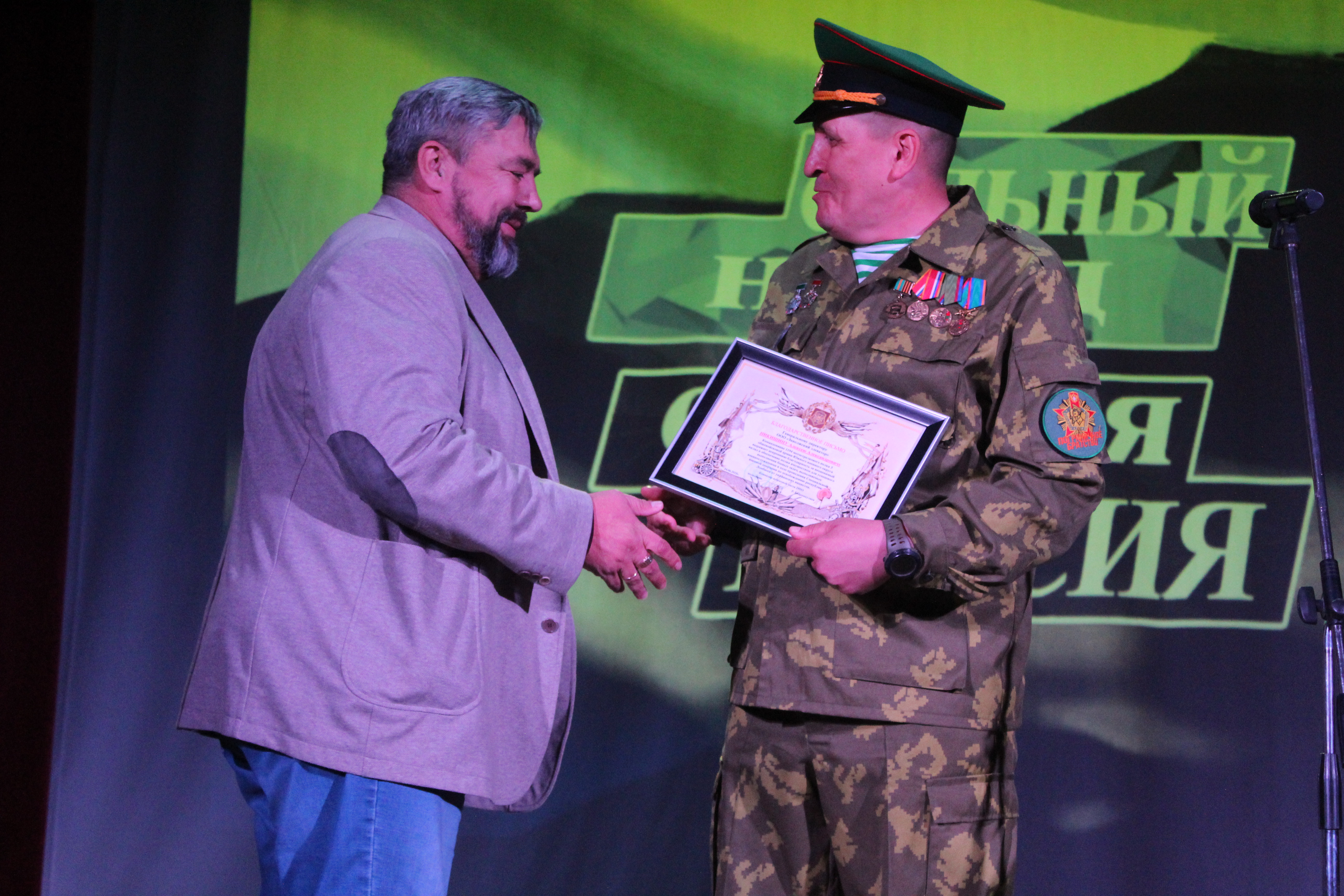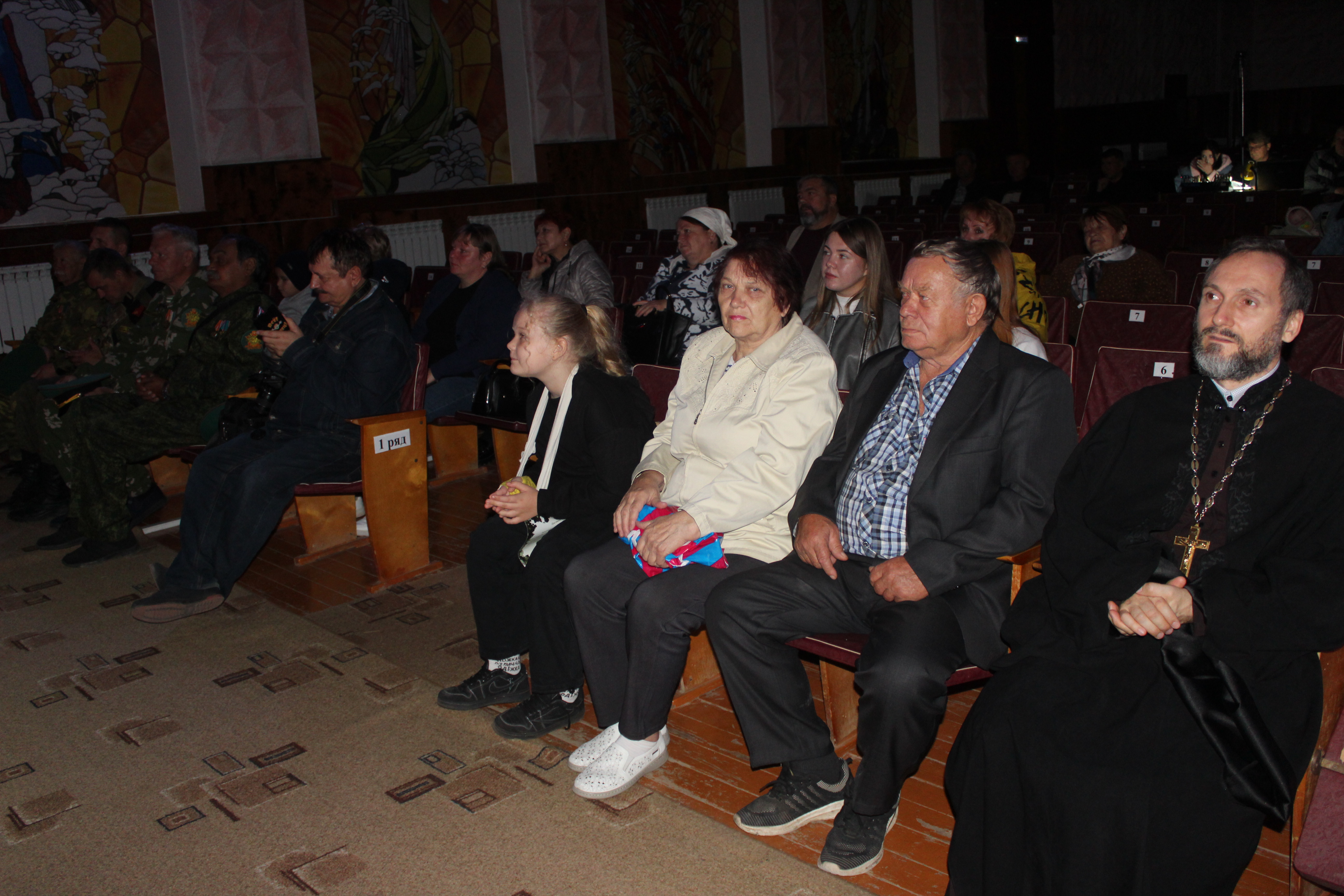 Песню "Аллея славы" в исполнении А. Захарова зал слушал стоя. В ходе встречи звучали слова поддержки и благодарности нашим бойцам от Е. Выдыш, председателя районного женсовета, настоятеля храма о. Евгения, Пограничного братства. О. Комиссаров вручил медали и грамоты за помощь бойцам руководителям фермерских хозяйств от командира части, где служат наши земляки, бойцу - подарок от земляков.