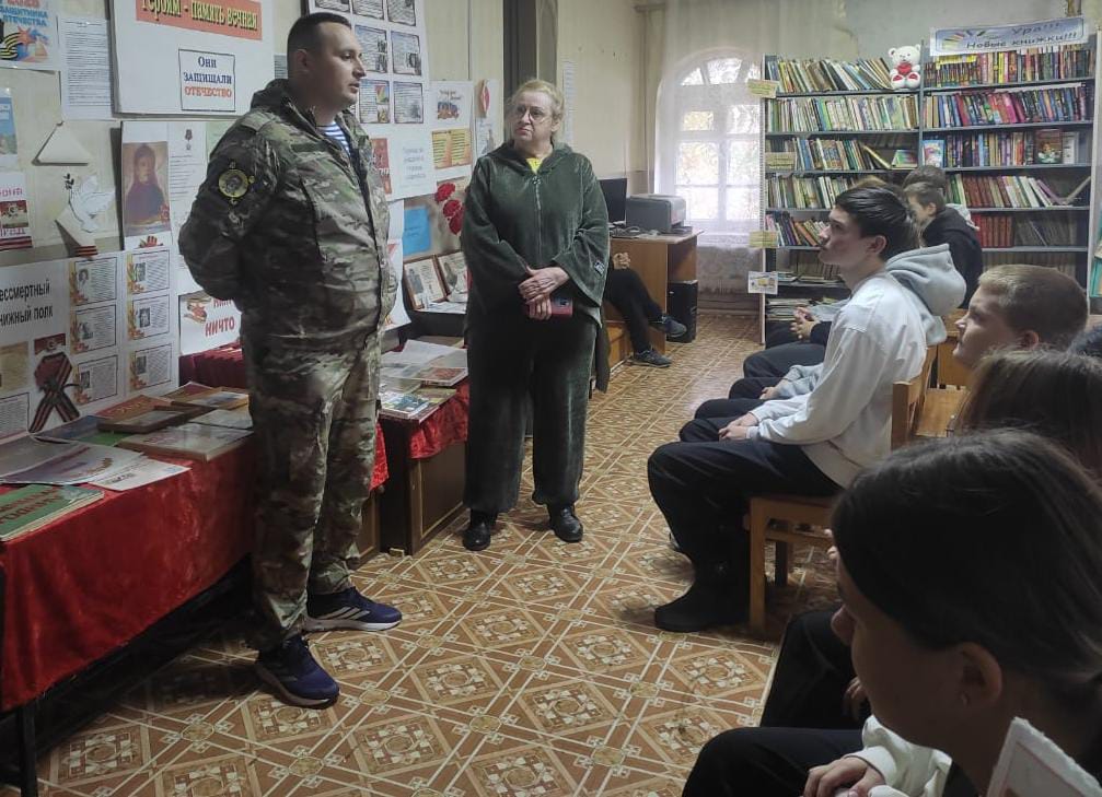 Ребята из отряда юных волонтёров побывали в сельской библиотеке, где библиотекарь Елена Виленская организовала патриотическую встречу с бойцом Ильёй Оторовым.
