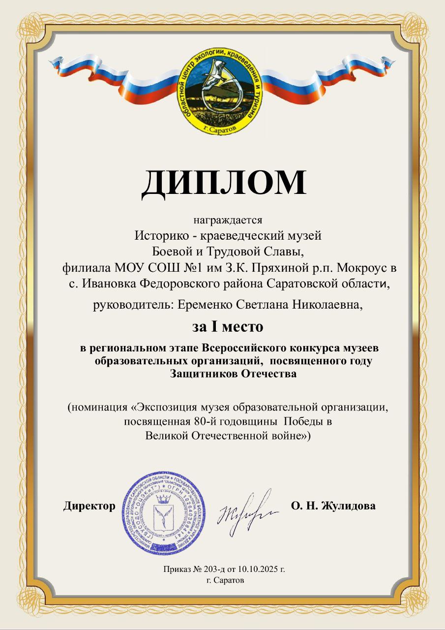 Историко-краеведческий музей школы села Ивановка занял первое место в региональном этапе Всероссийского конкурса музеев образовательных организаций, посвященного Году защитника Отечества с работой "Подвигу лежит дорога в вечность".