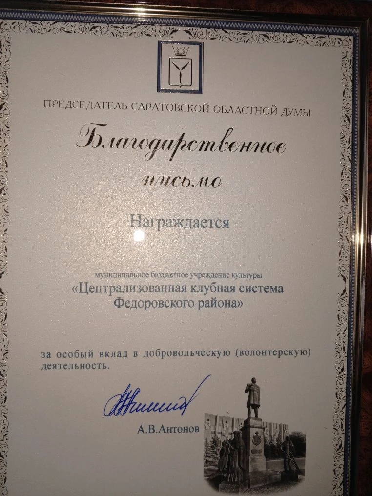 Благодарственным письмом облдумы отмечена централизованная клубная система Федоровского района, директор Ольга Кутузова.