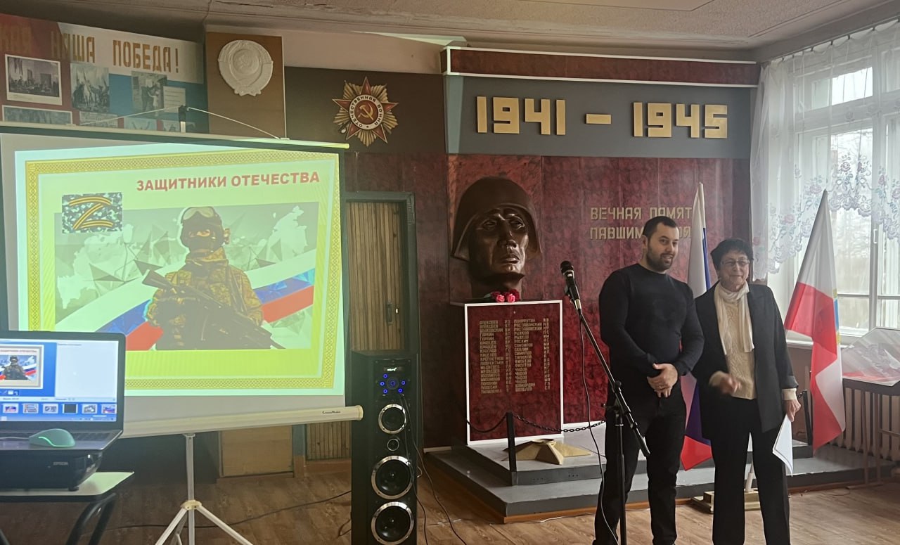 Ребята, сидевшие в зале, незримо шли вровень непростой дорогой с бойцами СВО. А на экране – фотографии земляков – героев СВО Сергея Церковного, Александра Руденко, Алексея Казакова, сопровождающие рассказом об их подвигах.