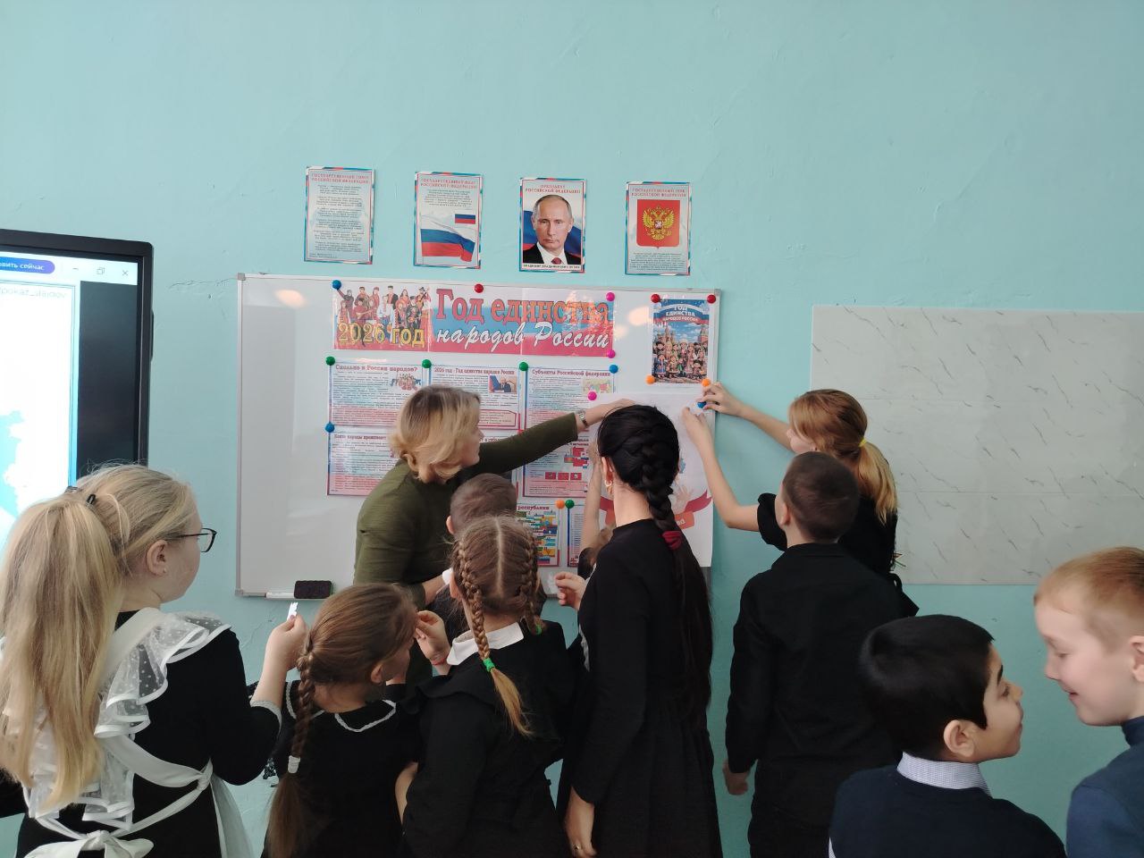 Также в школе оформили тематический стенд, посвящённый Году единства народов России. Таким образом, открытие Года единства народов России состоялось. Впереди ребят ждут важные события, разговоры и дела, которые помогут лучше понять друг друга и почувствовать силу нашего единства.