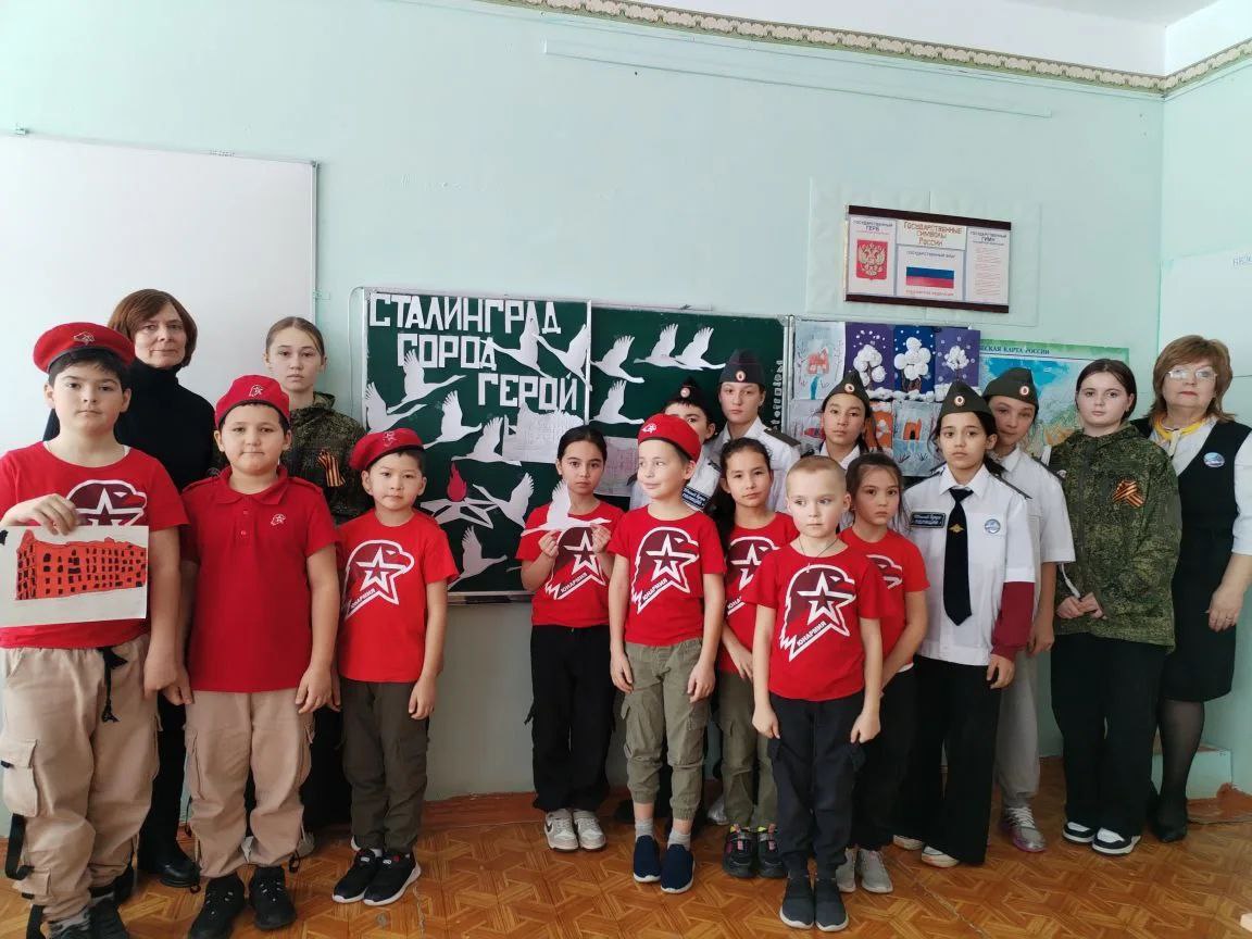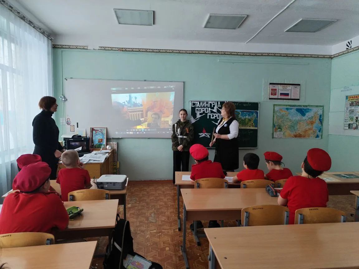 Ведущие рассказали ребятам 1-4 классов о событиях и героях исторического сражения. Вместе посмотрели документальный фильм «Сталинград» и обсудили его. Накануне мероприятия командир отряда Злата Юн и активисты Движения Первых посетили семью Кудря, старожилов села Еруслан. Кудря Дмитрий Иванович (1943 г. р.) поделился воспоминаниями о своём отце, Кудря И. Е., который жил в Сталинграде и трудился на тракторном заводе. В это страшное время завод выпускал танки и снаряды, люди не хотели отходить от станков даже во время бомбёжки, и только когда фашистские войска подошли совсем близко, пришлось эвакуировать завод. Иван Кудря был ранен в ноги, не мог ходить. После лечения вернулся на завод, имел награду "За оборону Сталинграда".