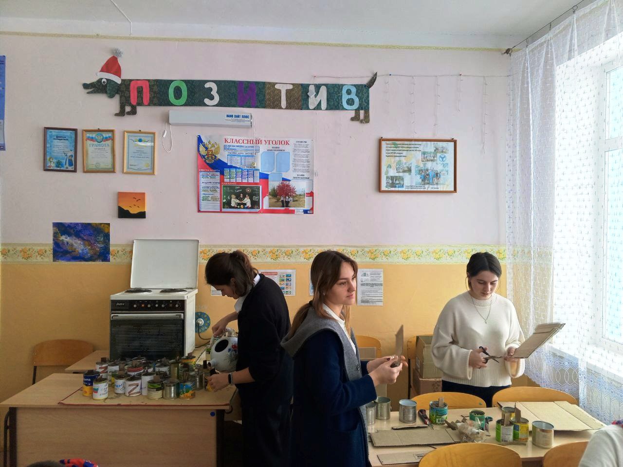 Потом школьники оформили свечи наклейками с теплыми пожеланиями нашим защитникам.