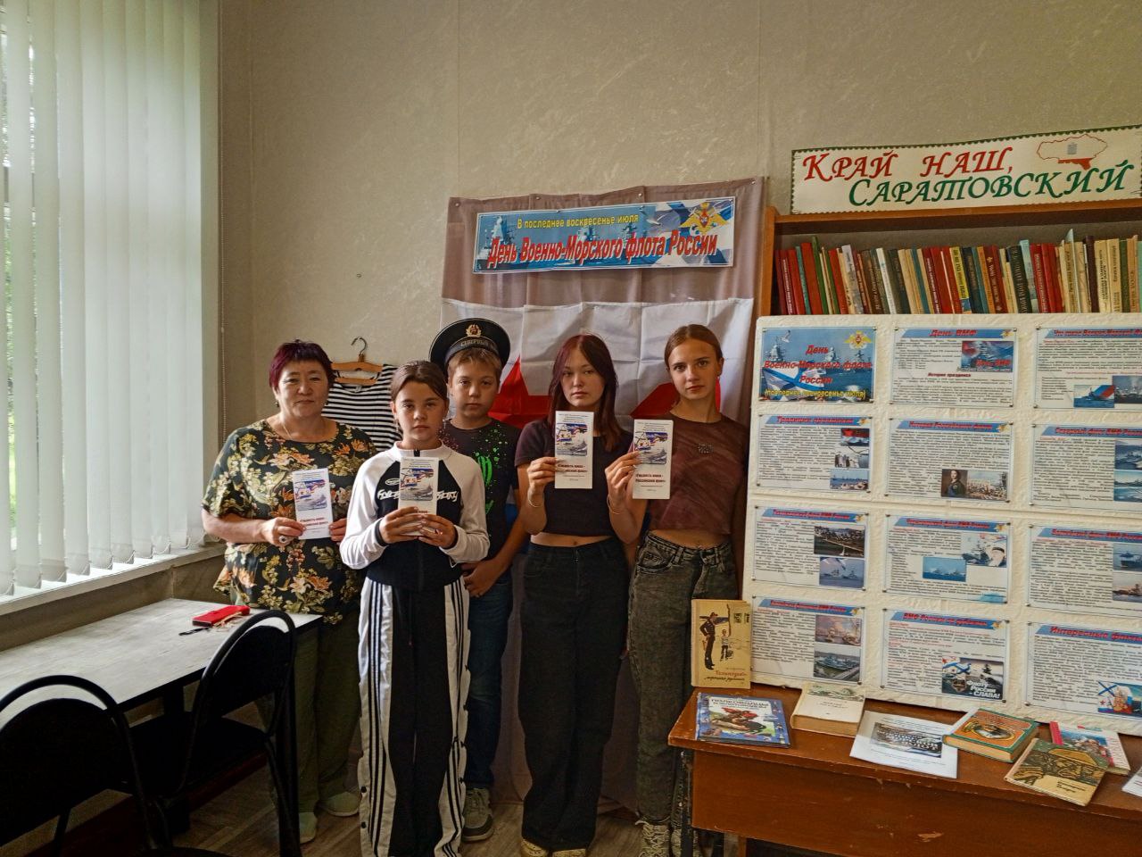 На мероприятии ребята узнали историю возникновения флота в России, с интересом прослушали рассказ об адмирале Кузнецове – основателе праздника ВМФ, о Петре I русском царе-флотоводце. В ходе рассказа читатели познакомились с литературой военно - морской тематики, о героях русского флота, о флоте России в разные периоды истории. С интересом отвечали на вопросы викторины на морскую тематику. Для присутствующих подготовили информационный буклет "Гордость наша - Российский флот". Для юных читателей подготовили рекомендательный список литературы "Российский военно - морской флот. От Петра великого до современности". С особой радостью и гордостью участники встречи сфотографировались в бескозырках - головном уборе российских моряков.