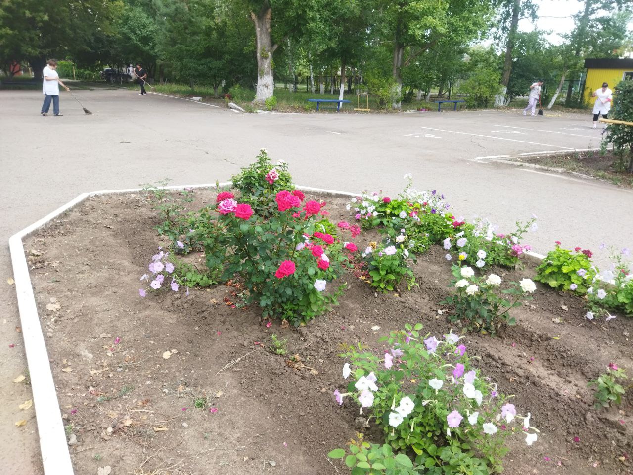 На территории больничного городка, славящегося благоустройством, сотрудники постоянно поддерживают идеальный порядок. Здесь благоухают розы, цветет герань, пестрит разноцветием петуния. Клумбы ухожены и политы заботливыми руками медицинских работников.