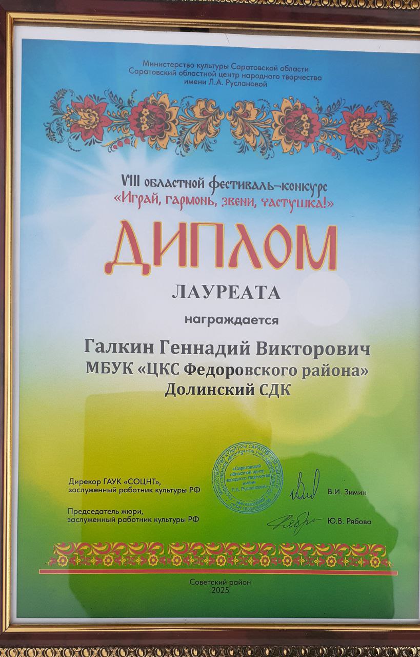 Федоровский район представил известный гармонист из Долины Геннадий Галкин, ставший обладателем диплома лауреата областного конкурса «Играй, гармонь, звени, частушка!». Коллеги от души поздравили Геннадия и пожелали новых творческих находок.