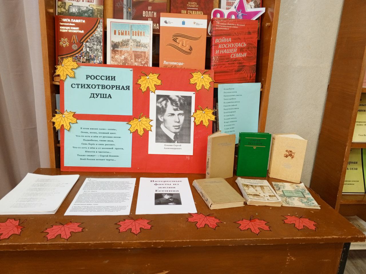Тема природы – одна из главных в творчестве поэта, потому что автор вдыхает в нее жизнь, она существует не отдельно от человека, а вместе с его мыслями и настроением. Любовь к русской природе была неотделима от любви к России в целом. Свои чувства поэт выразил в стихах: "В этом мире я только прохожий…", "Край ты мой заброшенный…", "Гой ты, Русь моя, родная…" К мероприятию в библиотеке была оформлена тематическая книжная выставка "России стихотворная душа".