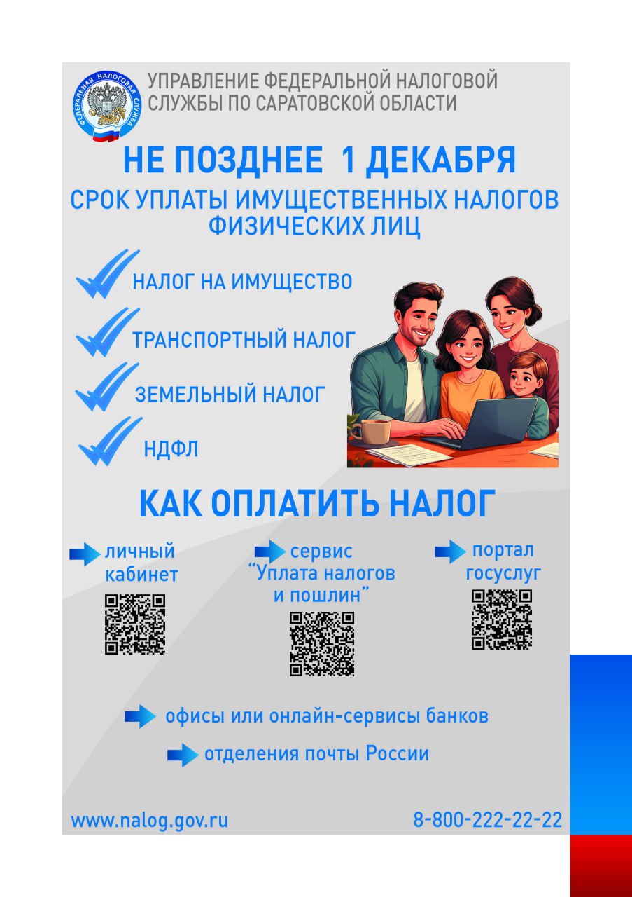УФНС России по Саратовской области напоминает: срок уплаты имущественных налогов физических лиц - не позднее 1 декабря