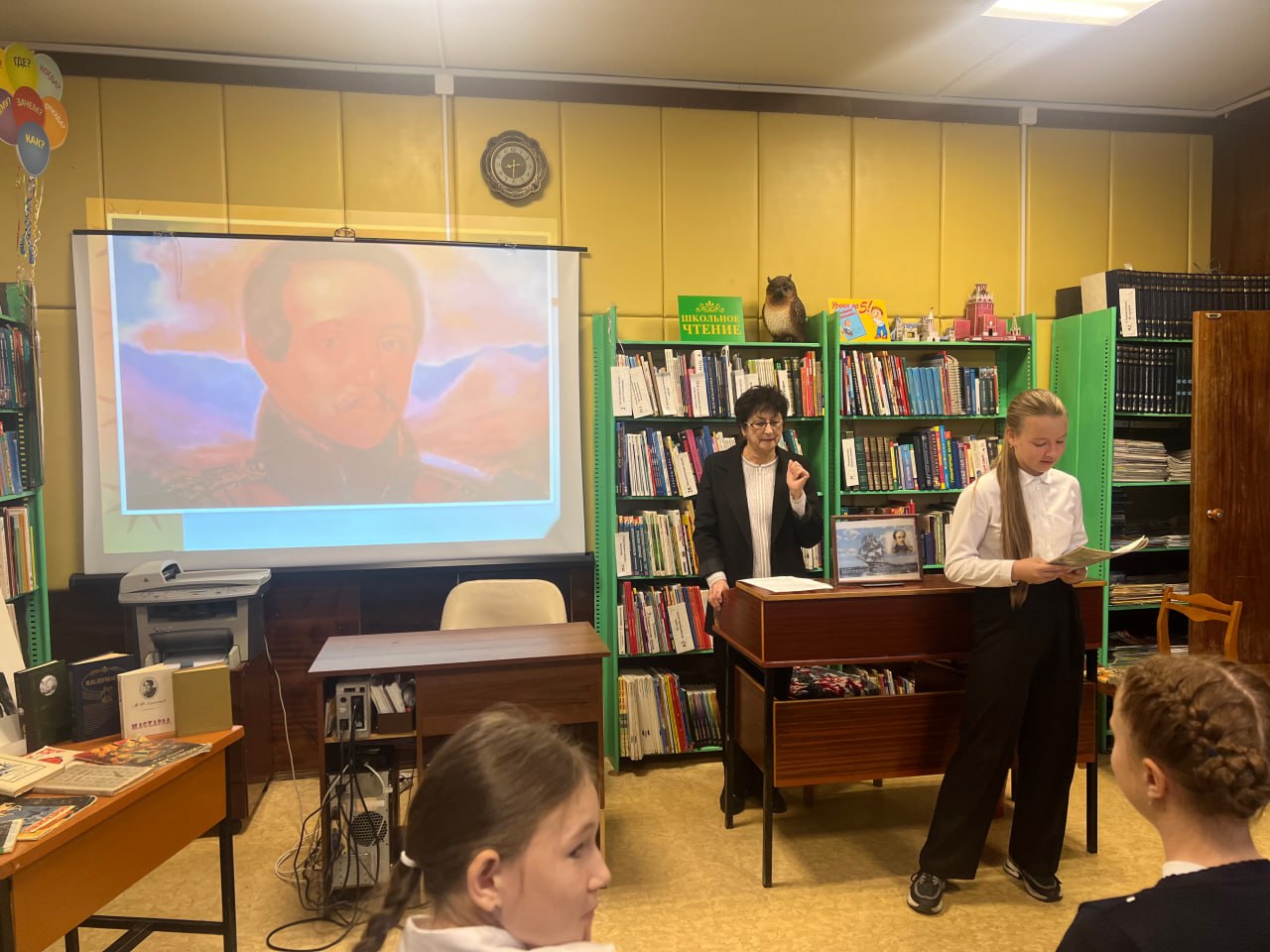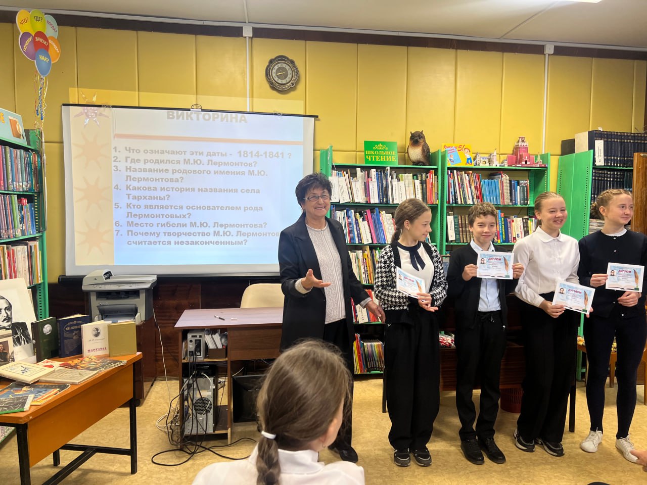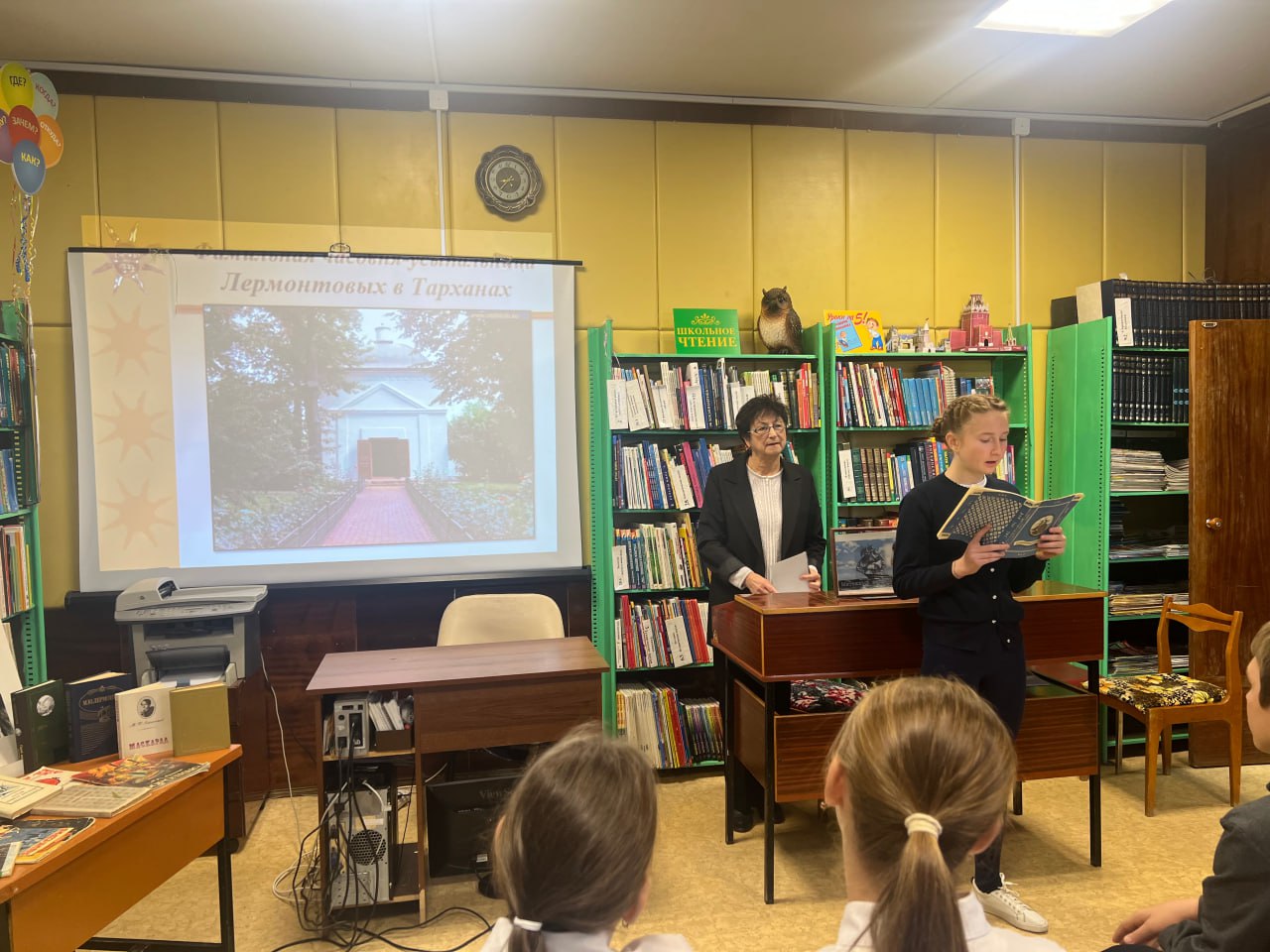 Н.В. Шамардина познакомила учащихся 6б класса Мокроусской школы (классный руководитель Н.А. Харитонова) с родословной поэта, детством, проведенном в Тарханах, годами учебы в университетском благородном пансионе и школе подпрапорщиков.