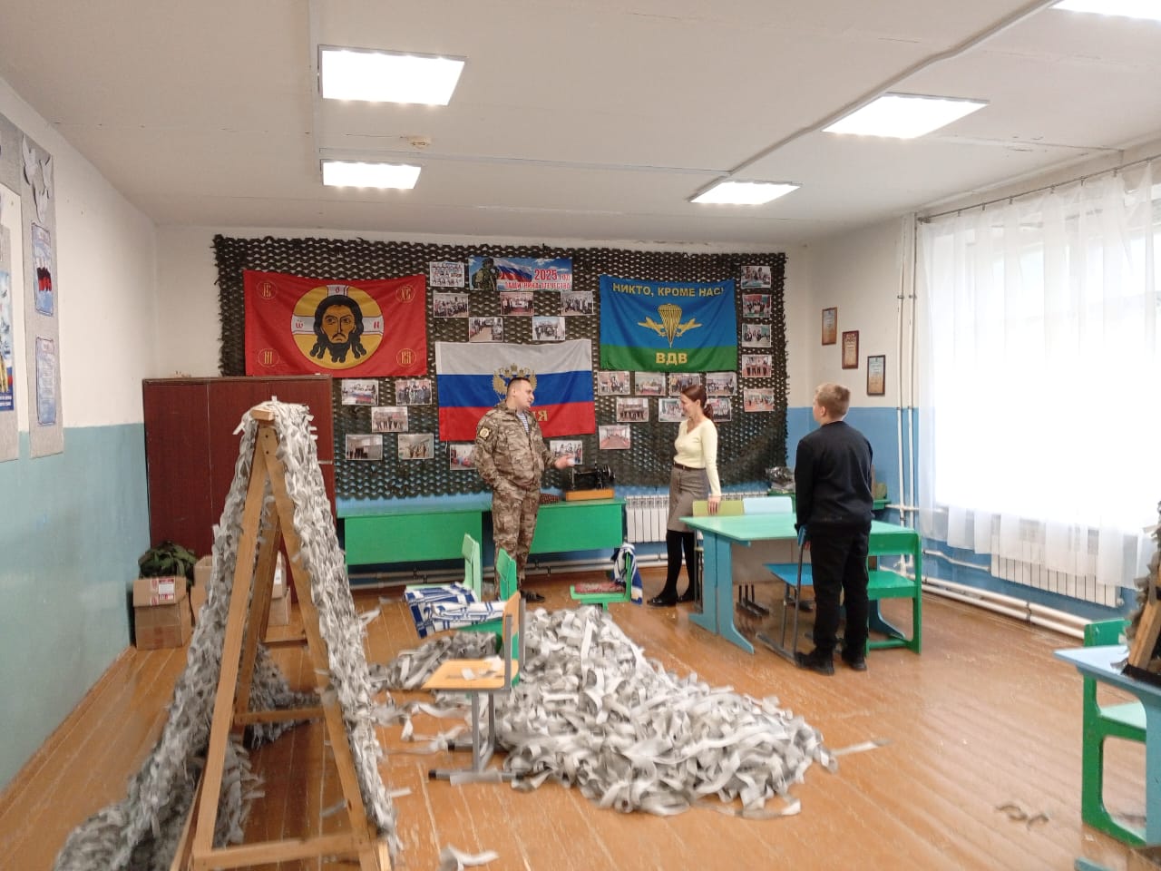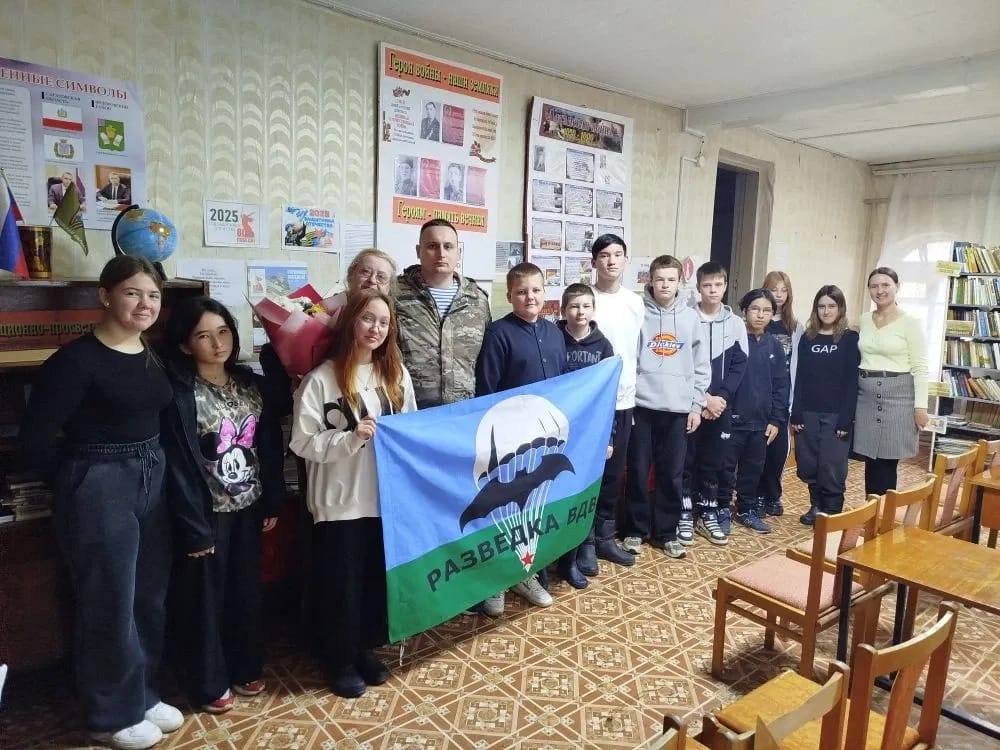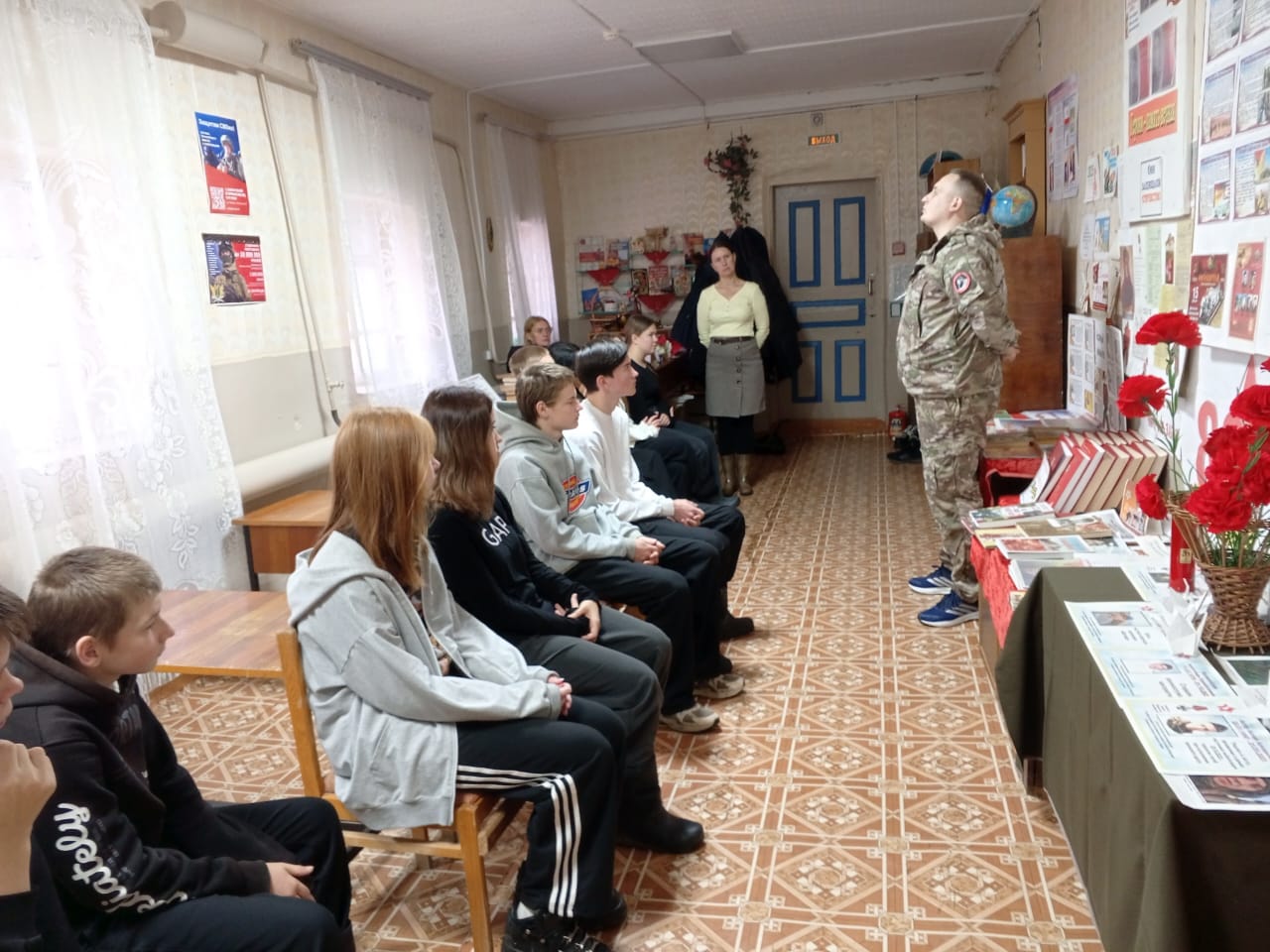 Ребята из отряда юных волонтёров побывали в сельской библиотеке, где библиотекарь Елена Виленская организовала патриотическую встречу с бойцом Ильёй Оторовым.