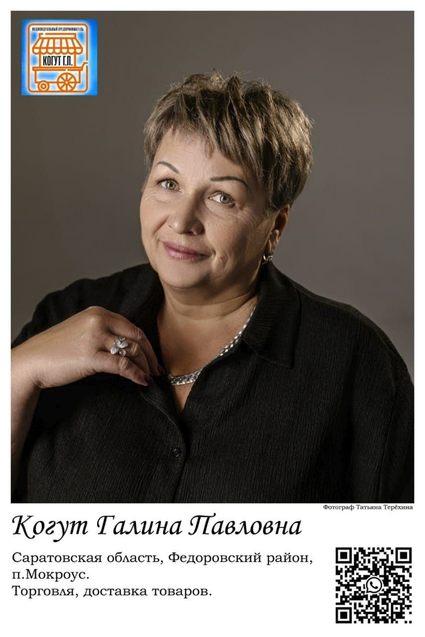 Галина Павловна не боится ничего нового. Смело идет навстречу неизведанному, пробует и внедряет в свою жизнь. Она стала участницей фотофестиваля женщин предпринимателей Саратовской области "Женский успех". Портреты, написанные на холсте и размещенные на мольбертах, говорят о глубине и важности события. У каждого есть QR-код, по которому можно войти на страницу и узнать о деятельности каждого предпринимателя. Галина Павловна считает, что это возможность рассказать о нашем Федоровском районе, поднять его престиж в сфере предпринимательства. Портреты выставляются в престижных торговых центрах г. Саратов. Сейчас галерея портретов, женщин, которые меняют бизнес, ландшафт города находится в ТК "Happy Молл".