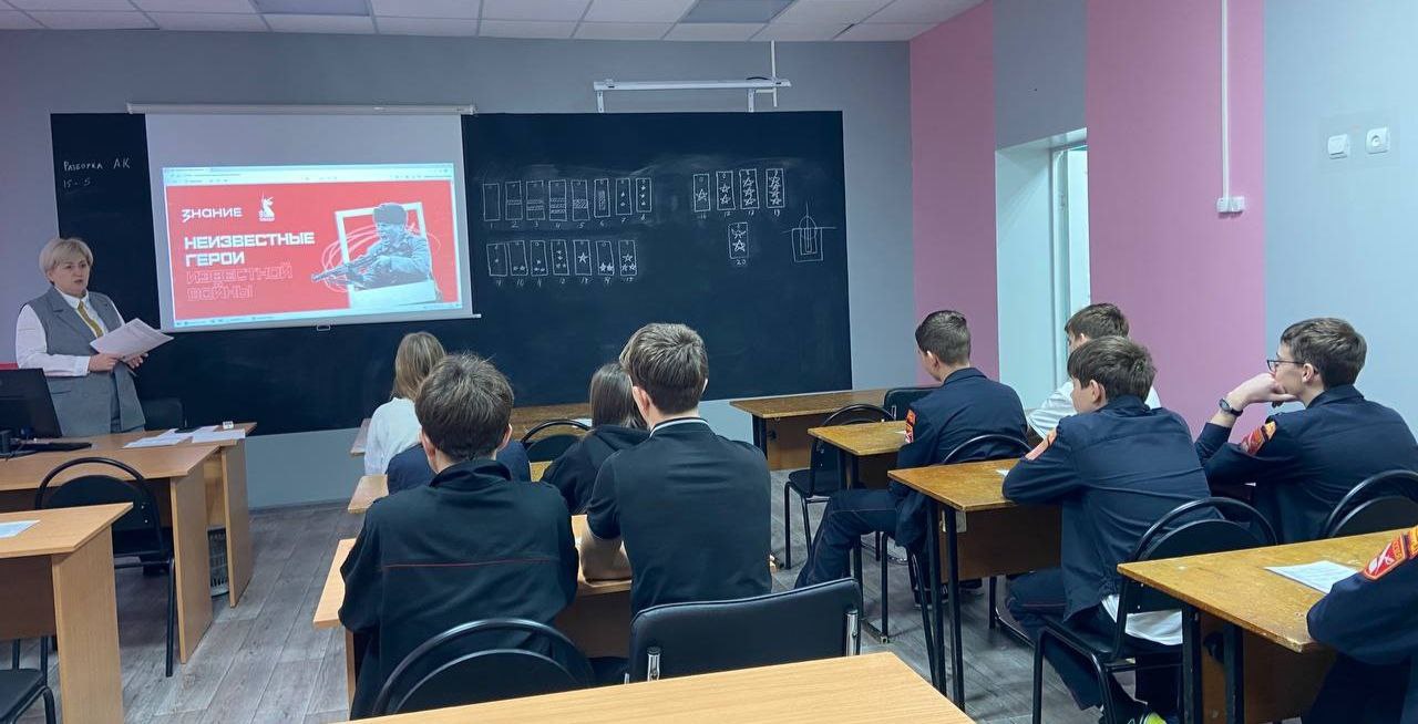 Также совместно с «Российским обществом «Знание» для старшеклассников провели познавательный патриотический классный час, в ходе которого говорили о поисковом движении и проводимой работе по поиску имен героев. Вместе обсудили, что стоит за словами «Никто не забыт, ничто не забыто», как важно хранить память в своей семье и передавать ее следующим поколениям.