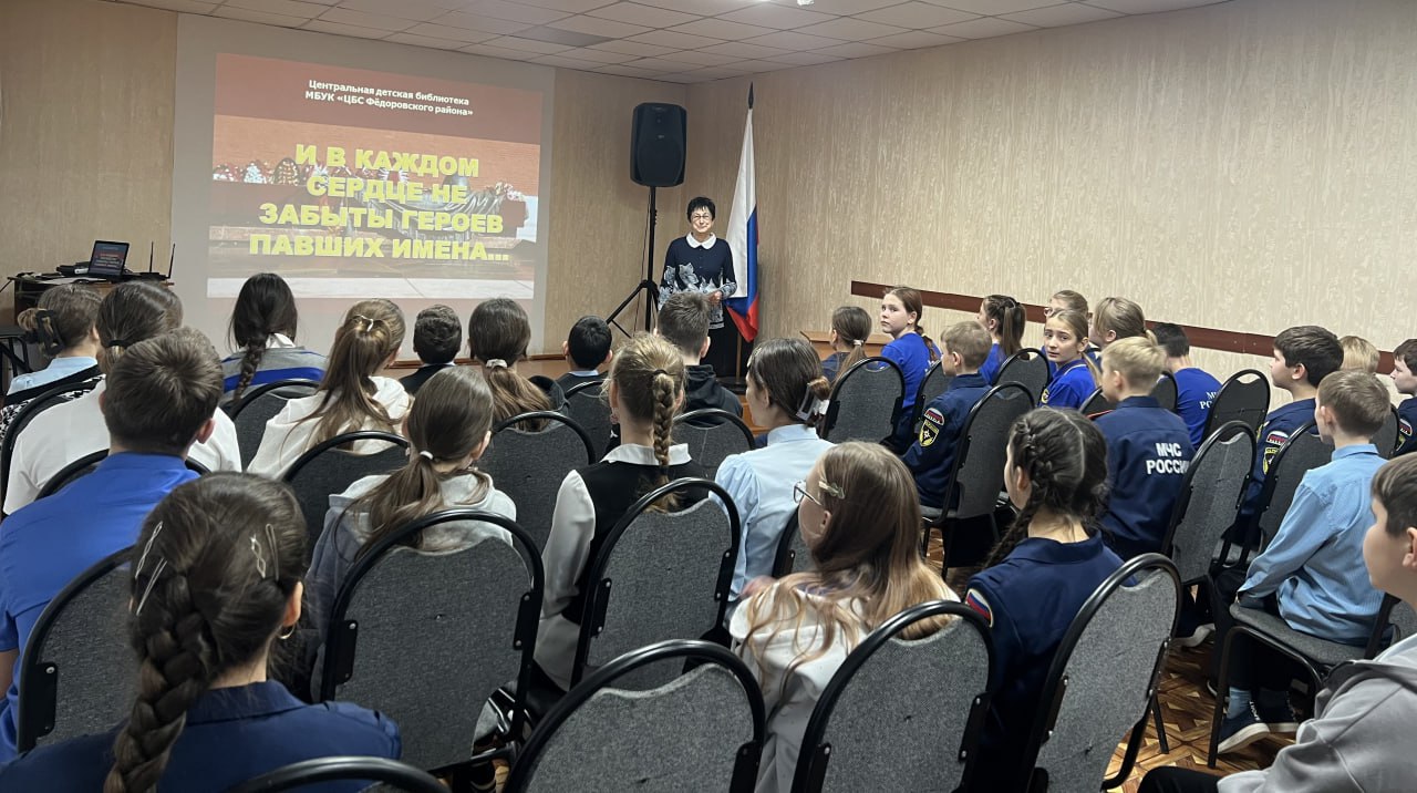 Урок мужества «И в каждом сердце не забыты героев павших имена…», подготовленный центральной детской библиотекой, познакомил учащихся 5а и 6б классов Мокроусской средней школы им. З.К. Пряхиной с историей этого памятного дня, с его значением для ныне живущих. Слайд-презентация помогла школьникам совершить заочную экскурсию по мемориальному комплексу, посмотреть развод Почетного караула, несущего вахту на посту №1.