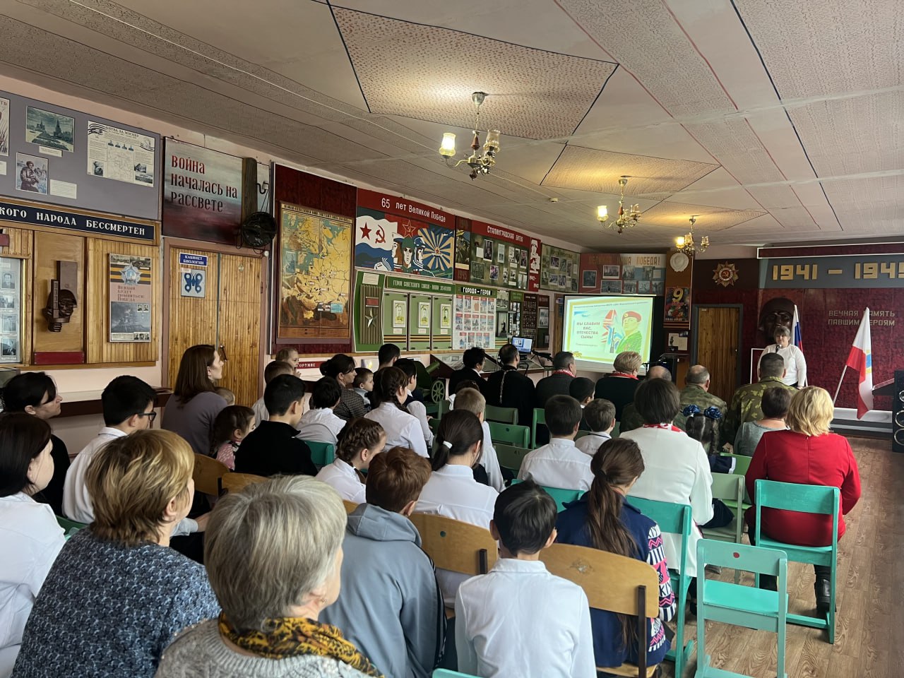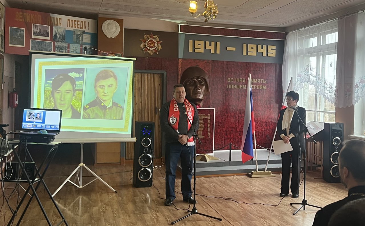 Ребята, сидевшие в зале, незримо шли вровень непростой дорогой с бойцами СВО. А на экране – фотографии земляков – героев СВО Сергея Церковного, Александра Руденко, Алексея Казакова, сопровождающие рассказом об их подвигах.