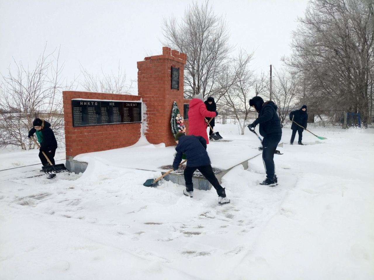 Акция «Снежный десант» по уборке территории памятника героям-землякам продлится всю зиму и первые месяцы весны.