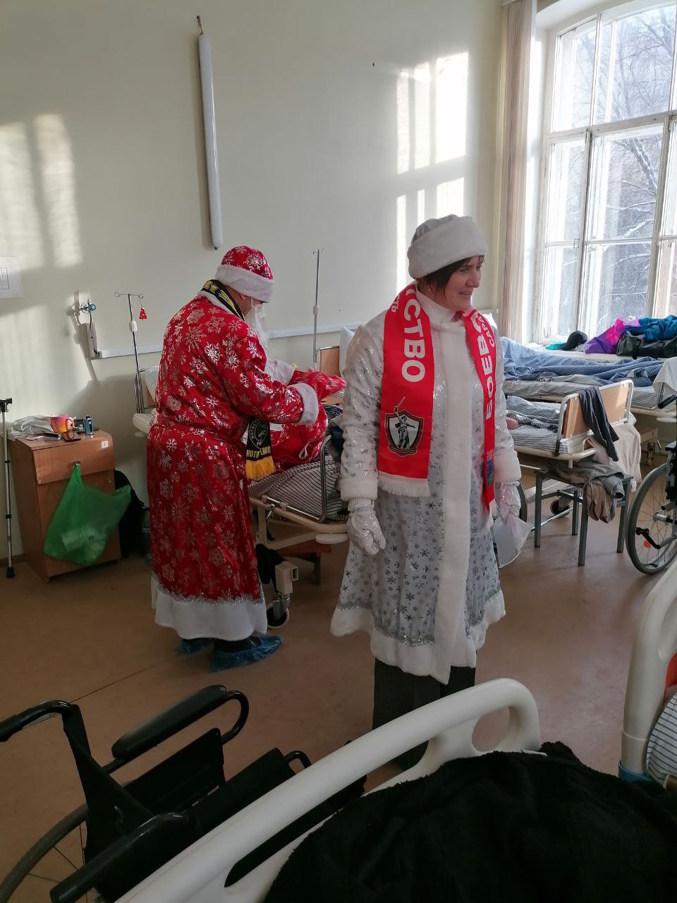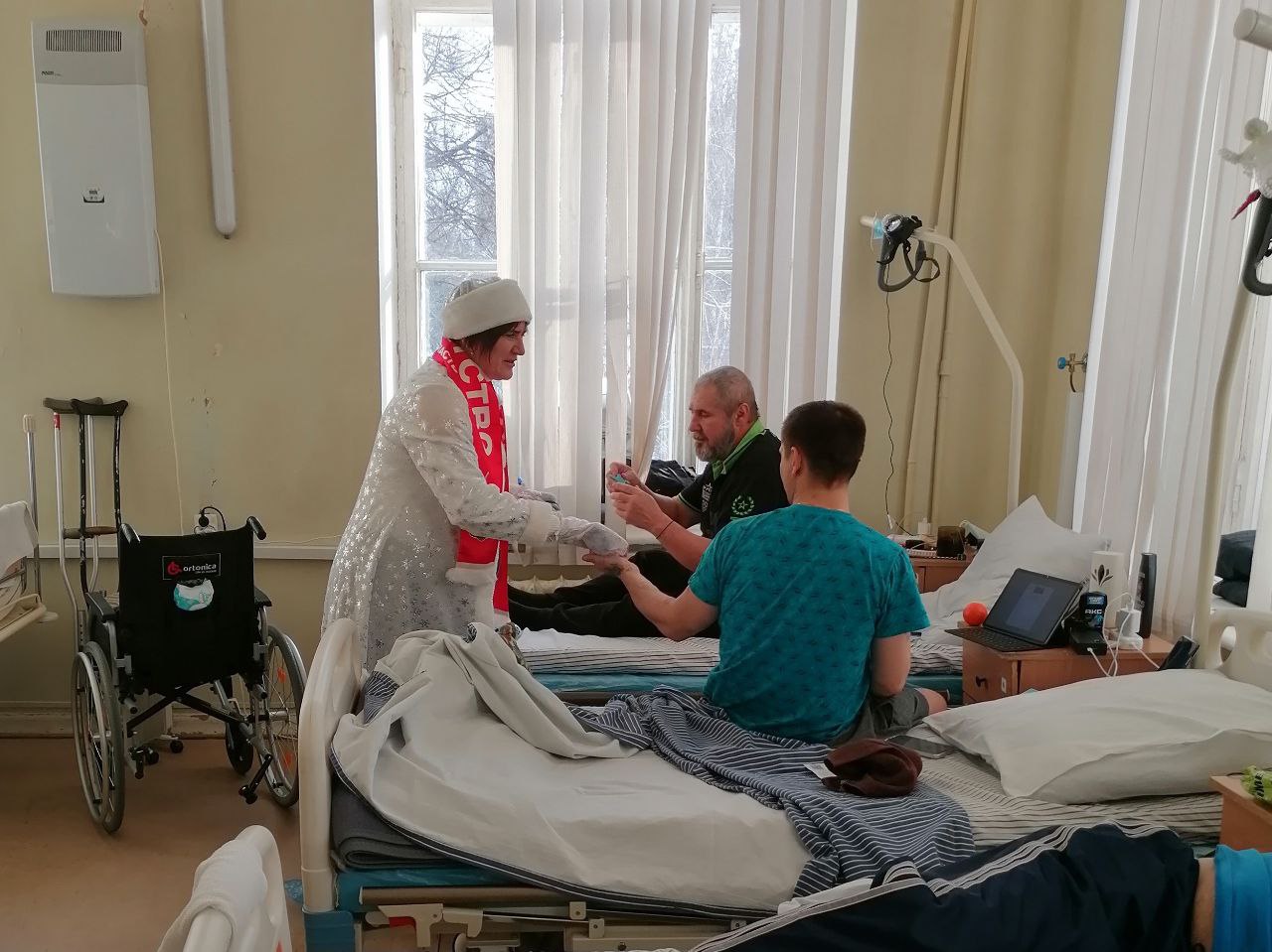 В первые дни Нового года волшебство приходит туда, где его ждут больше всего. Классный руководитель из школы поселка Солнечный, член "БОЕВОГО БРАТСТВА" О.В. Ситарук в образе Снегурочки вместе с Дедом Морозом навестила пациентов военного госпиталя.