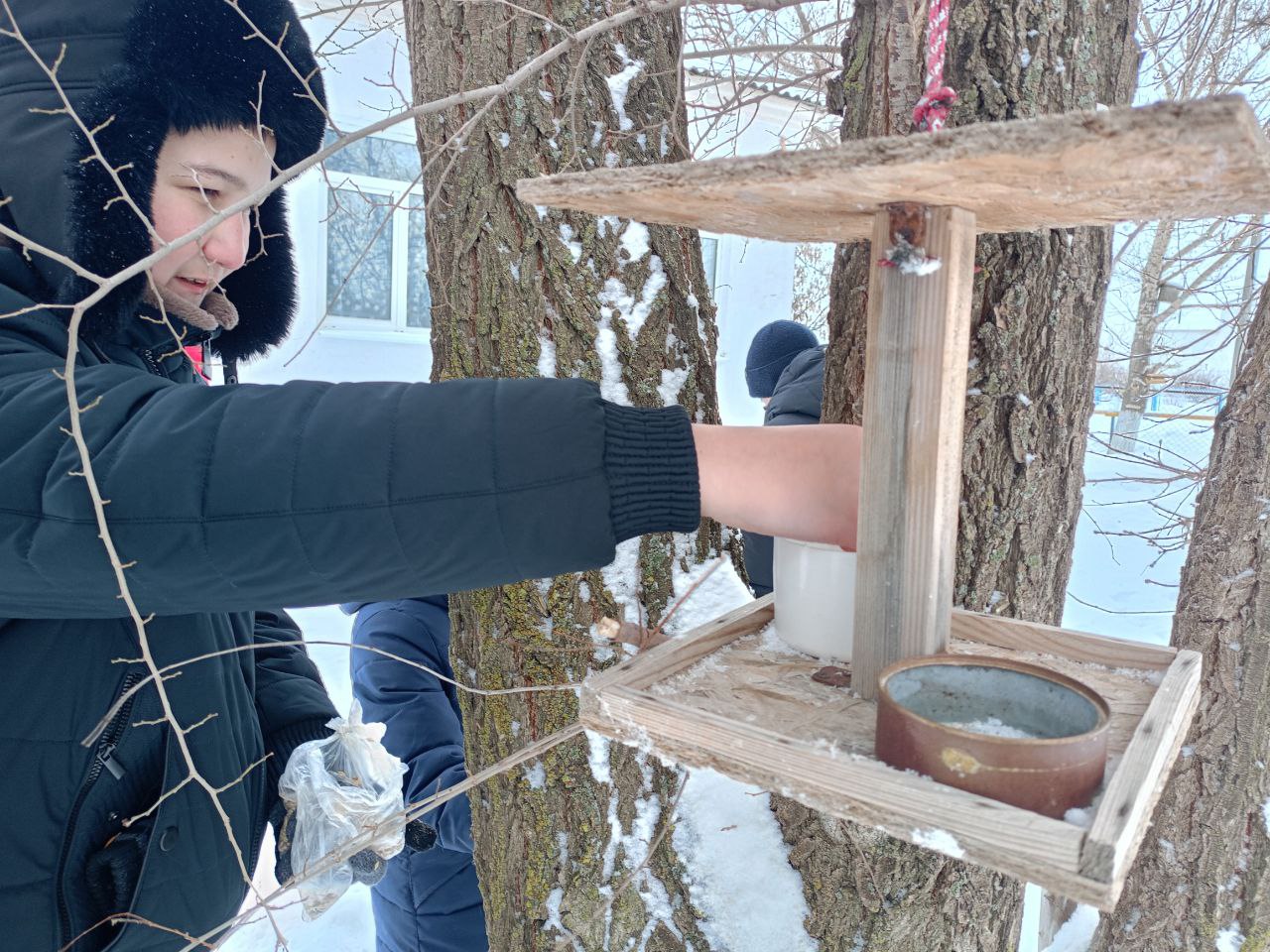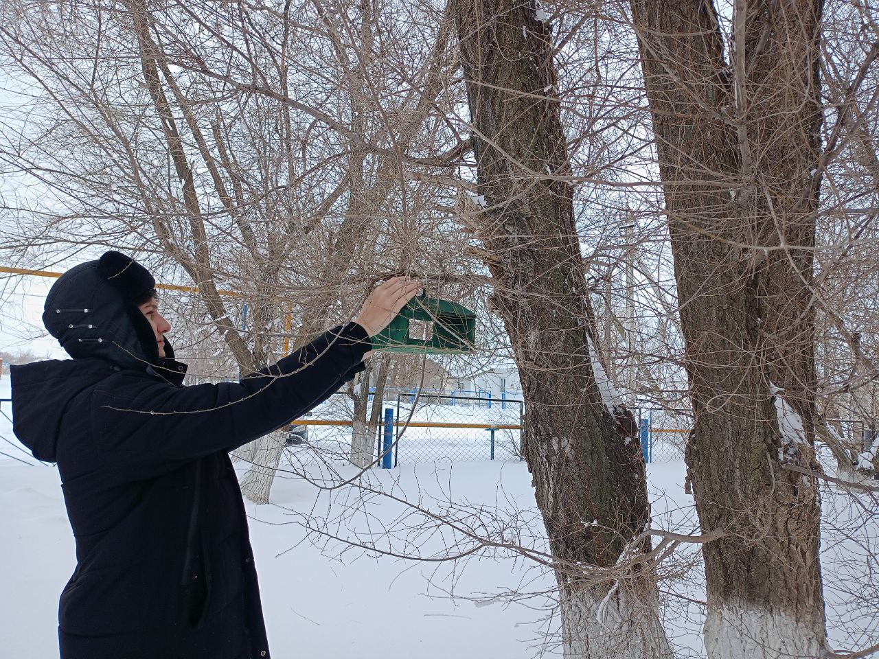 По традиции ребята изготовили кормушки дома с родителями, а в школе нашли сохранившиеся с прошлого года и развесили на деревьях около школы.