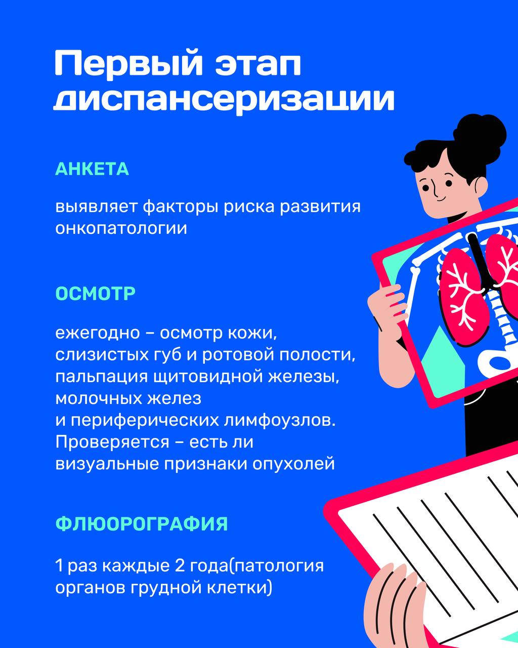 Диспансеризация проводится в два этапа. Подробнее — в карточках