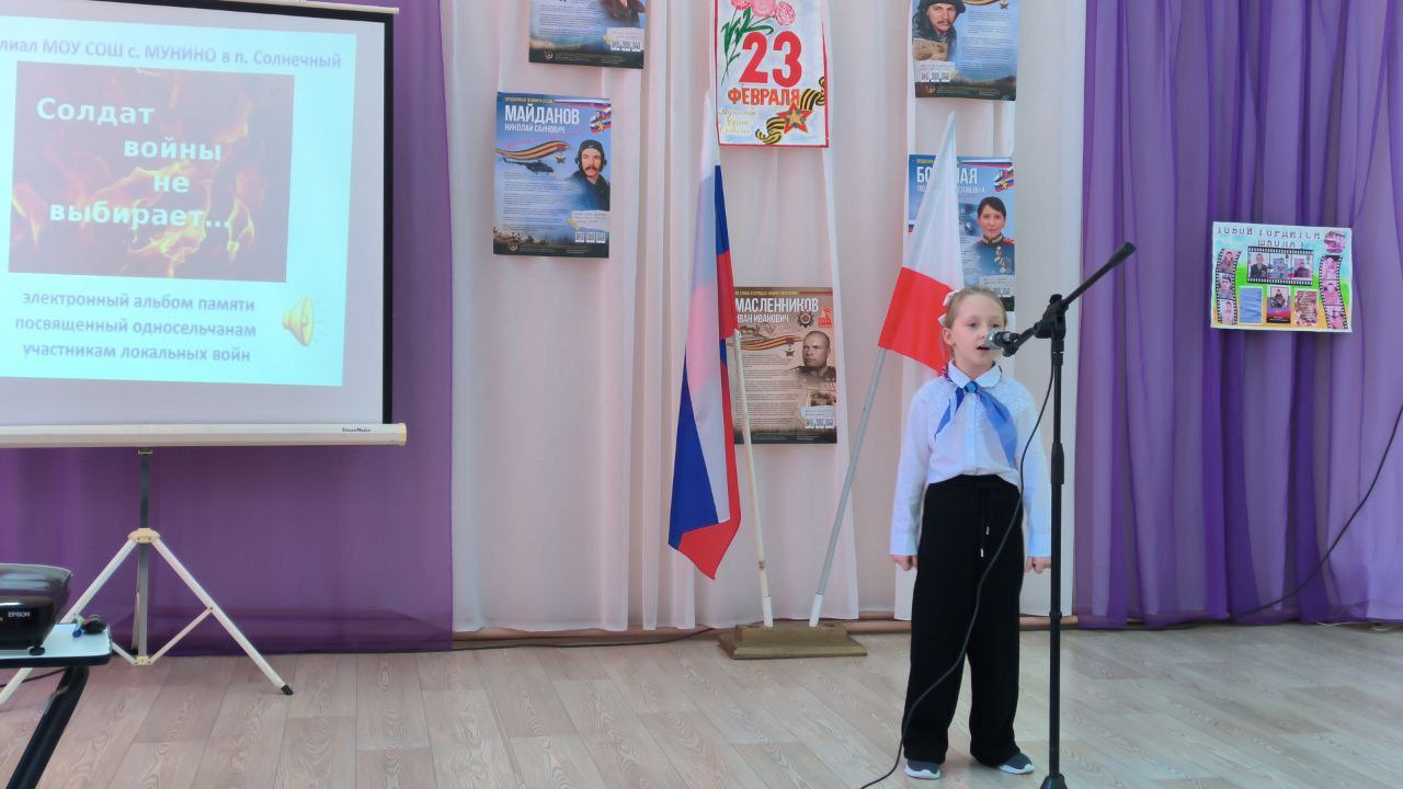 Ведущие рассказали о праздновании Дня защитника Отечества в разные исторические периоды. В ходе презентации электронного альбома об односельчанах, выполнявших воинский долг за пределами Отечества, ребята познакомились с подвигами земляков во имя независимости Родины. На экране сменилось три поколения защитников Отечества. Все лица были знакомы, но героические факты биографии наводили на мысль, что в жизни всегда есть место подвигу.