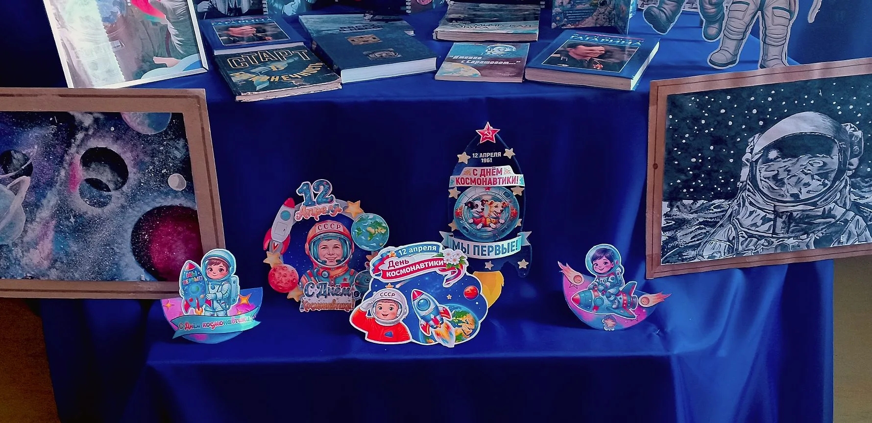 В честь юбилея первого полёта человека в космос для митрофановских читателей открылась выставка книг, буклетов и рисунков ребят из кружка ИЗО «Фантазия». Дети видят космос ярко и вдохновенно!